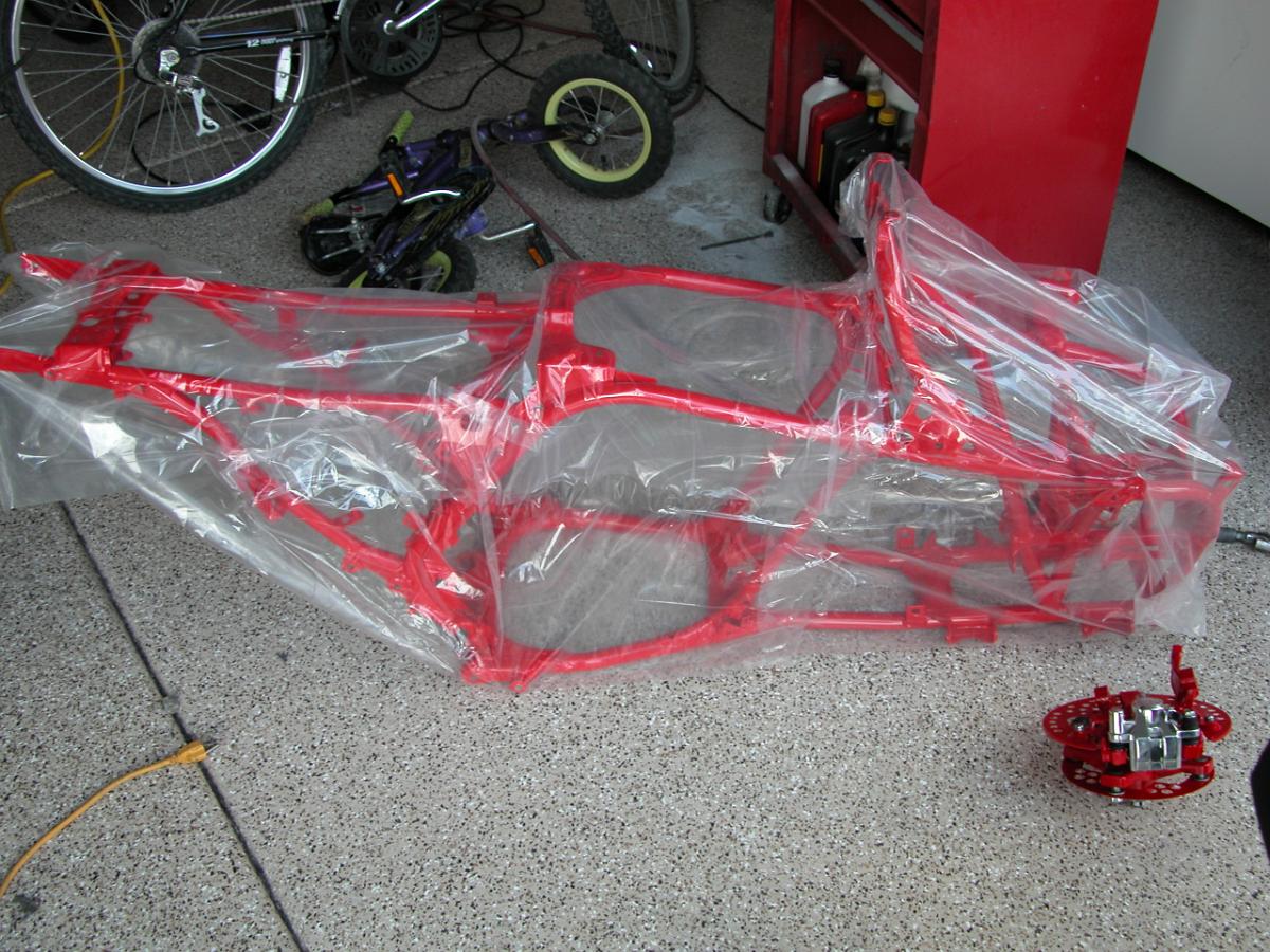 The frame and rear bearing carrier were taken to Electro Tech Coatings in Escondido, CA for powder coating. These folks are very cool. When I 1st brought them the frame and bearing carrier, I told them I wanted to get the frame sand blasted so I could haul it to the Banister Iron Works for the A-arm conversion kit installation and then return it for coating. Not a problem. They called me the day after I dropped it off and said it was ready to go. Nice! A couple days at Banister Iron Works and I brought the frame back to Electro Tech. 3 days later it was done. These pics were taken not 30 seconds after I pulled the parts from the truck and about 10 minutes from getting the frame up on stands and prepping the engine mount hardware.