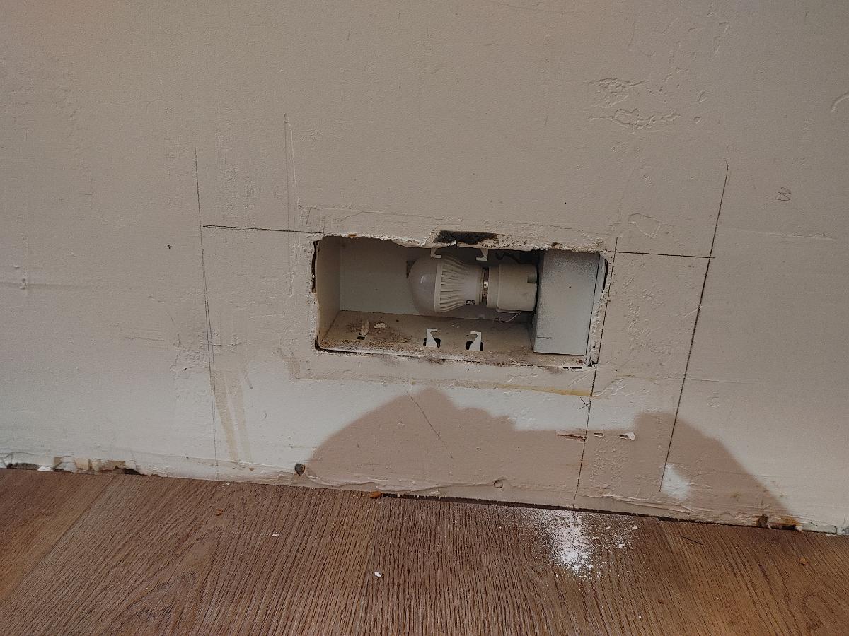 Hmm.. Stud finder said there are studs at the two widest lines, but an exploratory cut with the keyhole saw indicates a stud right at the edge of the enclosure. It makes sense because the enclosure is secured to the framing with a couple nail flanges on either end. Weird the stud finder didn't pick the other studs up.