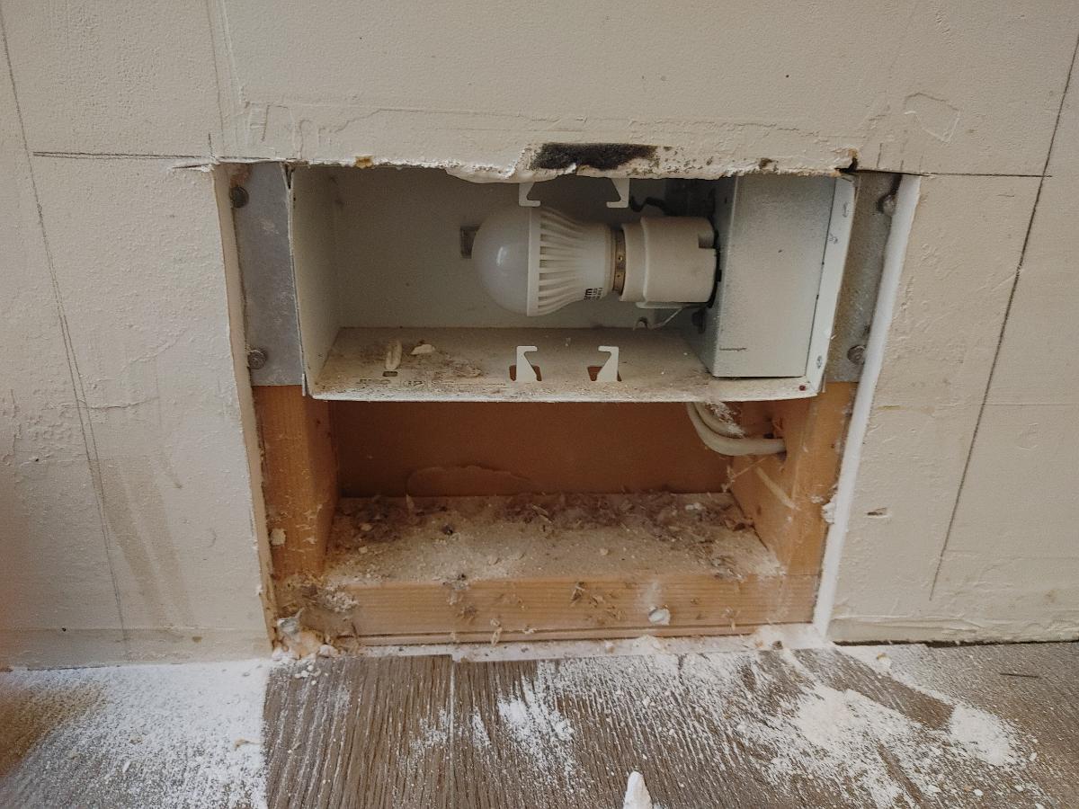 I found the other stud the same way and measured 3/4" from those marks and used the 'buzzy' saw to cut the drywall open. I'll pull those nails and the enclosure should come right out.
