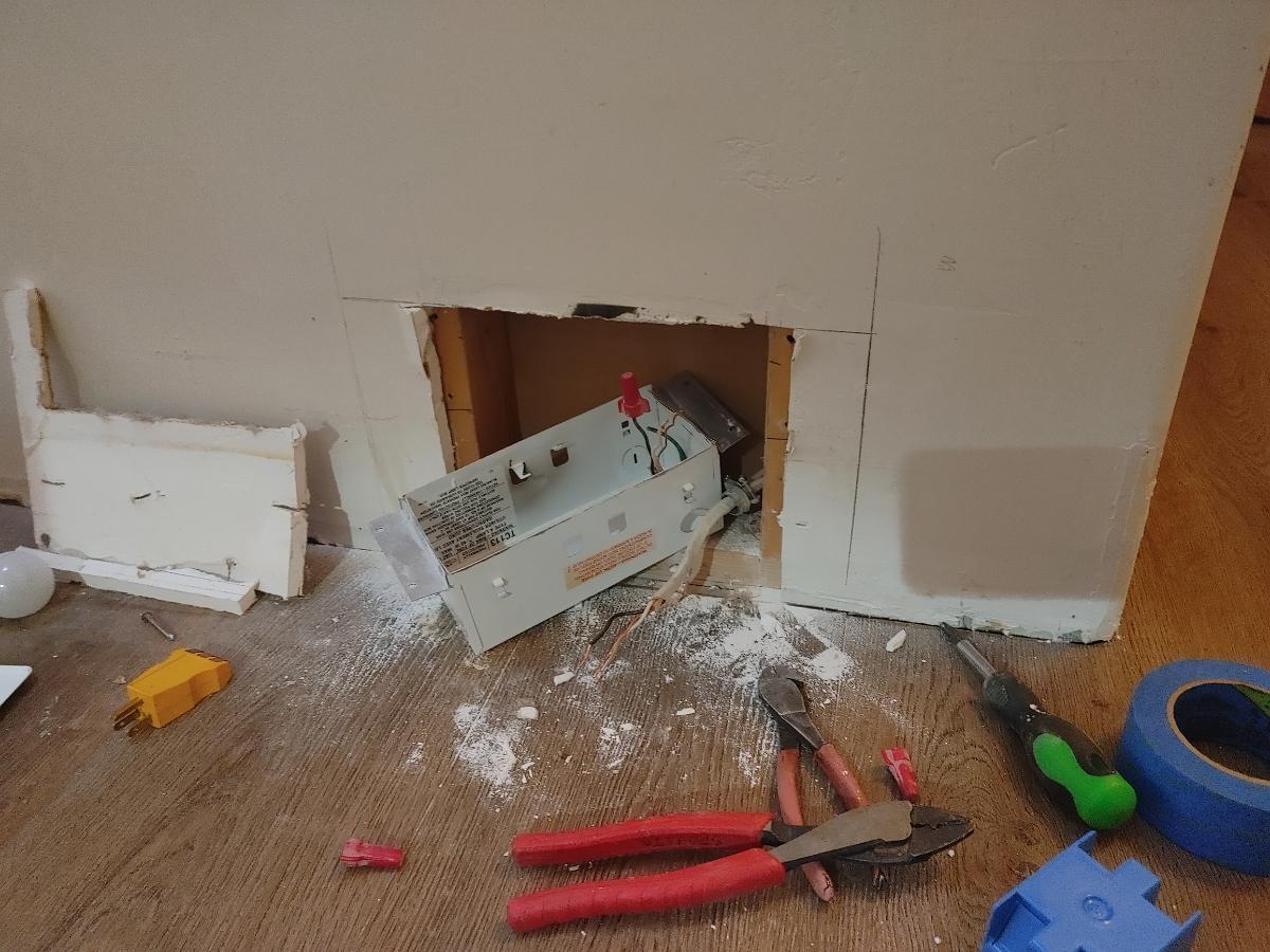 Back to the first light. Got the enclosure out and pulled the non-live Romex out. Black with the wire nut on it is still showing hot for some reason.