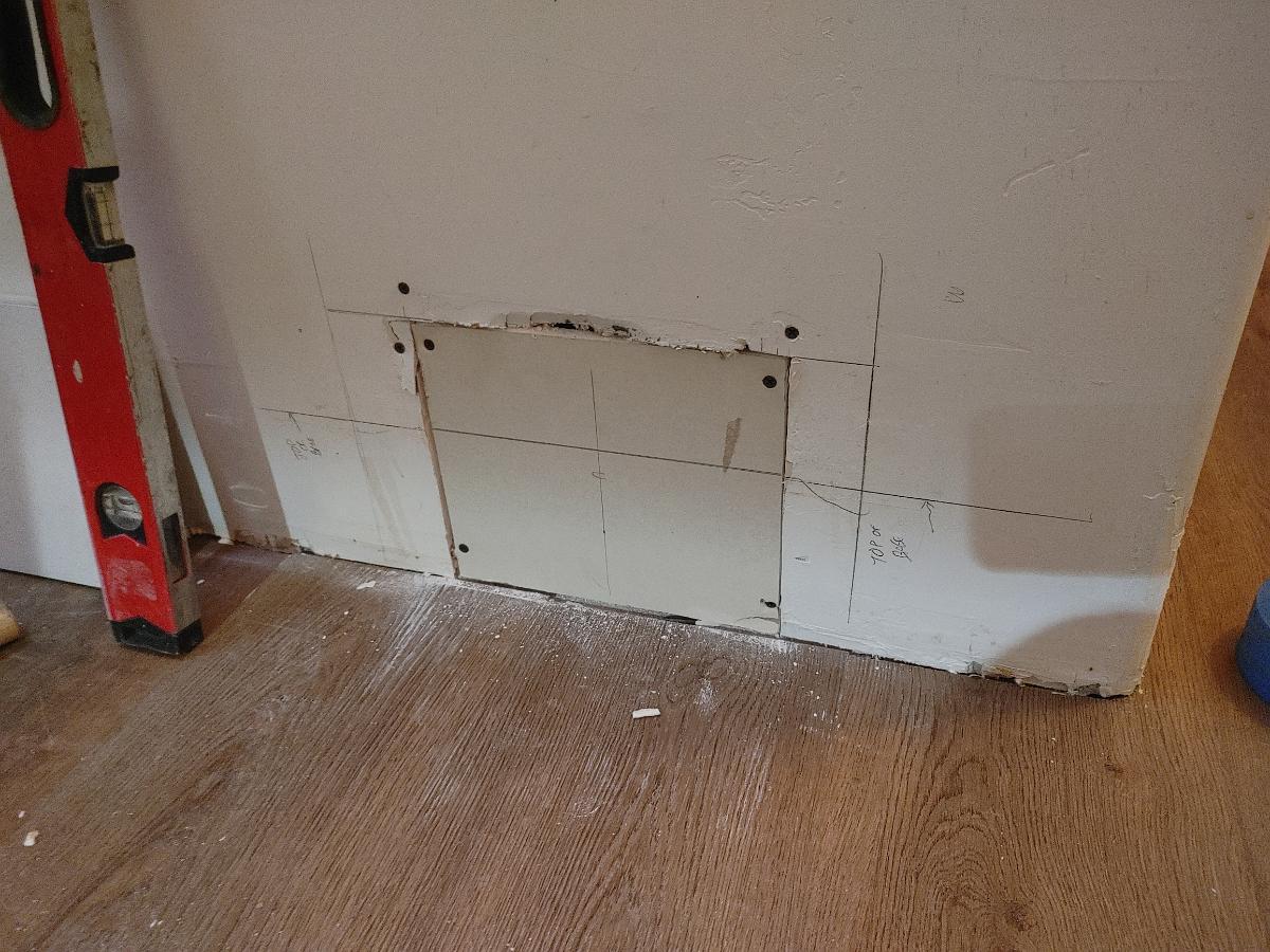 First drywall patch in place and I'm starting to lay out the hole for the new J-box that will go here.