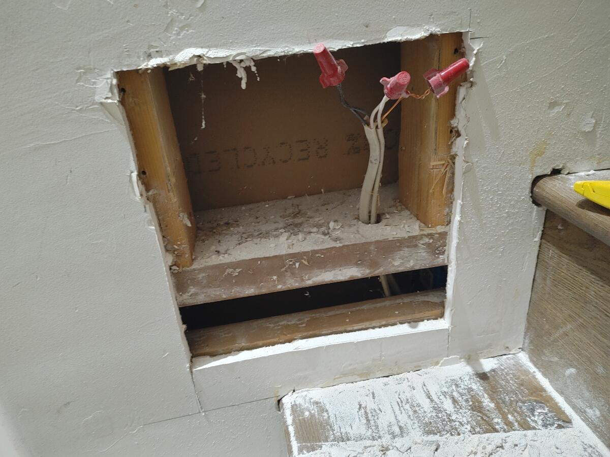 Sticking my hand in here, it feels like the piece that might need trimming is just a nailer for drywall. Time to pull the last one apart.
