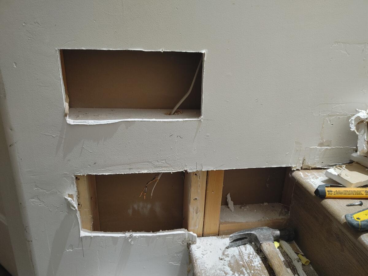 Original location was at the lower left, but there's not enough wire to reach the baseboard location, so I opened up the wall a bit more to see if I could move it to the next tread up. I can feel where the wire comes through the double stud on the right, but there's an odd something holding the wire to the stud. It feels like a staple used to hold radiant heat piping to the bottom of a subfloor....
