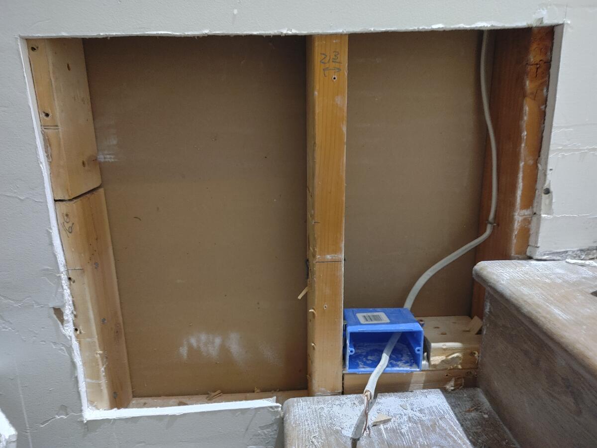 I knocked out the old fireblock (There's another about 2' up from here) and the nailer for the old fixture and 'repurposed' them for nailers along the left side of the opening and the bottom right.