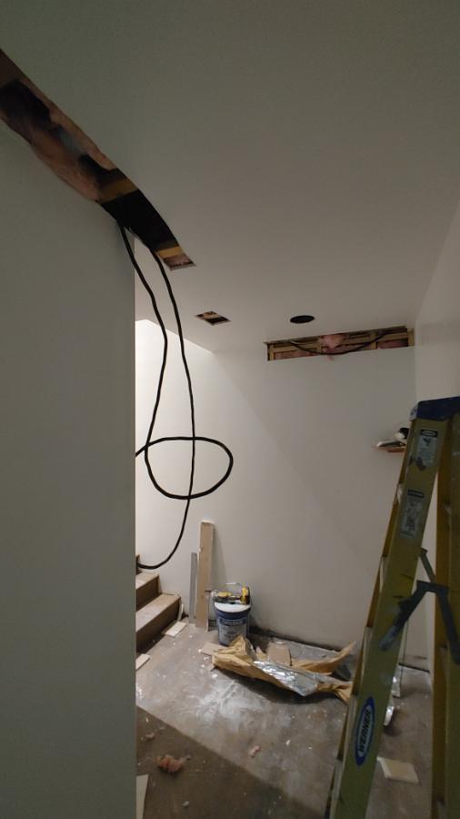 So....that plan didn't work at all. The holes in the floor joists aren't even close to being in line so pulling the new cable straight through isn't going to work. My son and I ended up opening up the entire left side of the hallway ceiling so we could route the new cable through all the wonky holes. Whoever drilled those holes needs to be slapped in the back of their head!