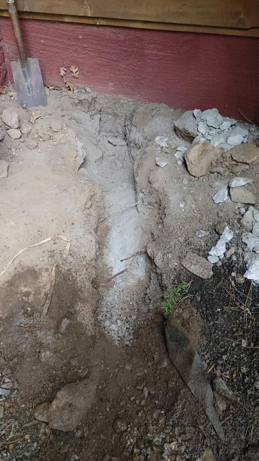 Since it was raining, I started at the sub panel end since it's under cover and I wouldn't get soaked. I was breaking up the ground with my demo hammer and a 3" chisel bit and 3 feet in, hit a big rock. (The white area in the center of the pic)