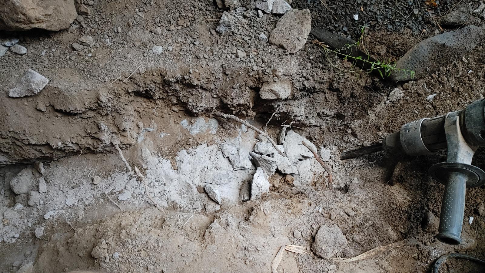 ....or so I thought. The wide chisel bit wasn't even denting it, so I switched to a 1" chisel. Very slow going as this rock is REALLY hard.
