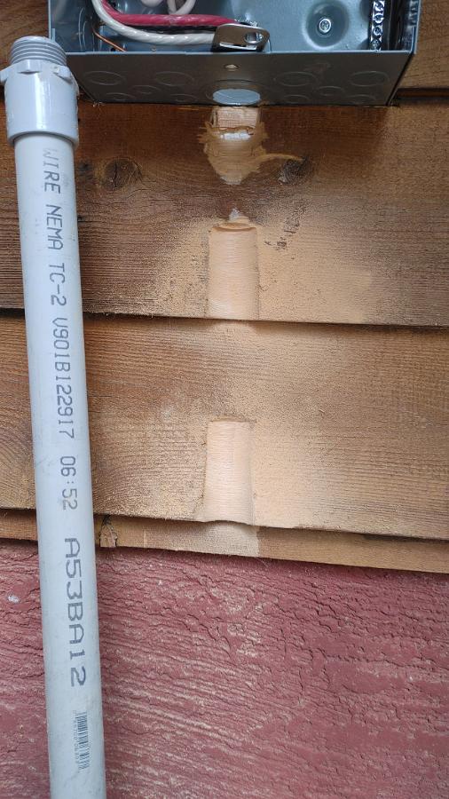The thicker edges of the siding had to be relieved a bit as well to get the conduit to run plumb to the house. A small sanding drum on a drill made quick work of that.