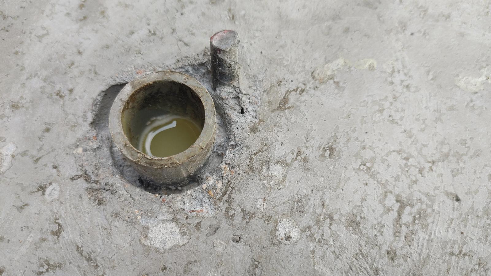 Some judicious drill work with a 1/8" masonry bit and a small chisel got me enough clearance to get a coupler slid all the way on. The liquid in the conduit is muriatic acid. I'm hoping it'll eat enough of the concrete so that I can break it up and push it out with compressed air. It's stopped bubbling so I need to get it out and add more acid.