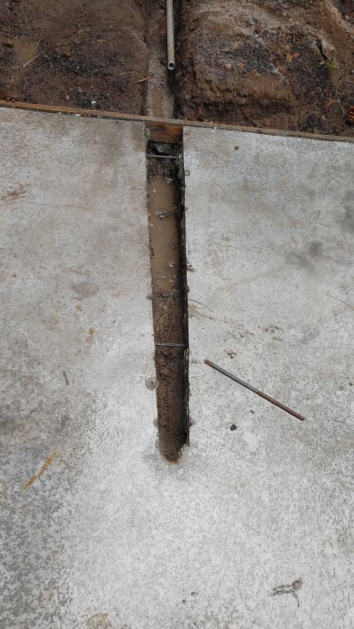 I hosed off the slab so I had a clean work area for replacing the last 6 feet of conduit. I'll need to let the water drain out of the trenches before I can do so....