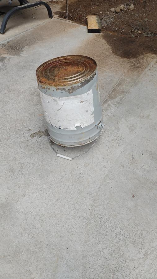 ....and an empty 5 gallon bucket and voila! Protected from any rain or pooling water. (I just noticed that my concrete patch came out pretty good!)