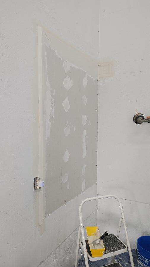 About halfway done with the tape and mud. I'll feather out the small patch on the right wall when I do that inside corner.