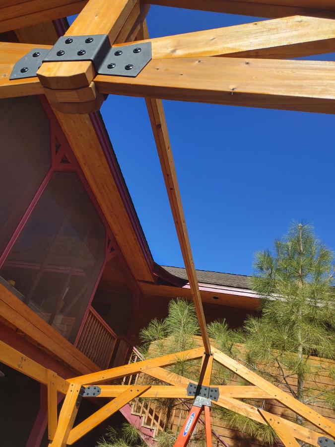 Ok, That wasn't too bad. Thankfully, the trusses leaned 'in' a bit and I was able to friction fit the beam in place before bolting it to the brackets.