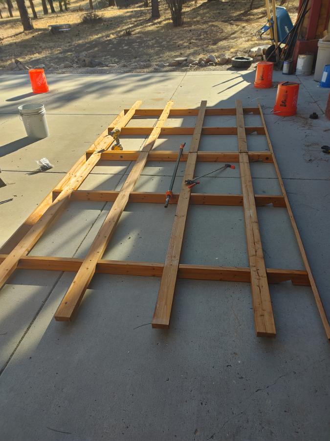 I had the 2 ridge pieces in the wrong orientation so had to remove them and flip them around so all the notches would line up in the supports. Everything now drops mostly into position, but I needed clamps to pull stuff into position and keep things square. The supports on the close end are all screwed off at this point.