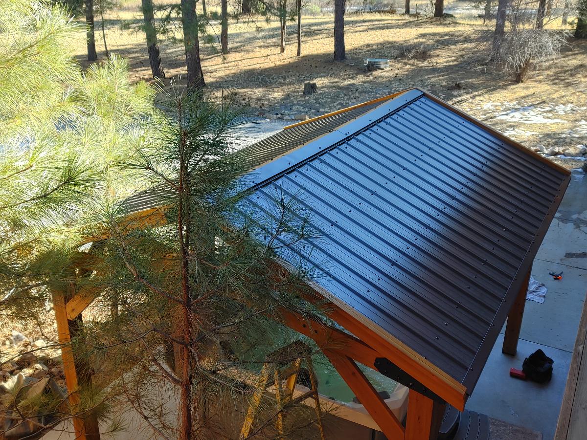 I thought I'd taken a picture of how I got the ridge cap screwed down from the inside, but I guess the shutter didn't actually release when I clicked it. I ended up putting folded up drop cloths on the edge of the hot-tub and put a scaffolding plank across the tub, then just walked my way across as I secured the cap in place.