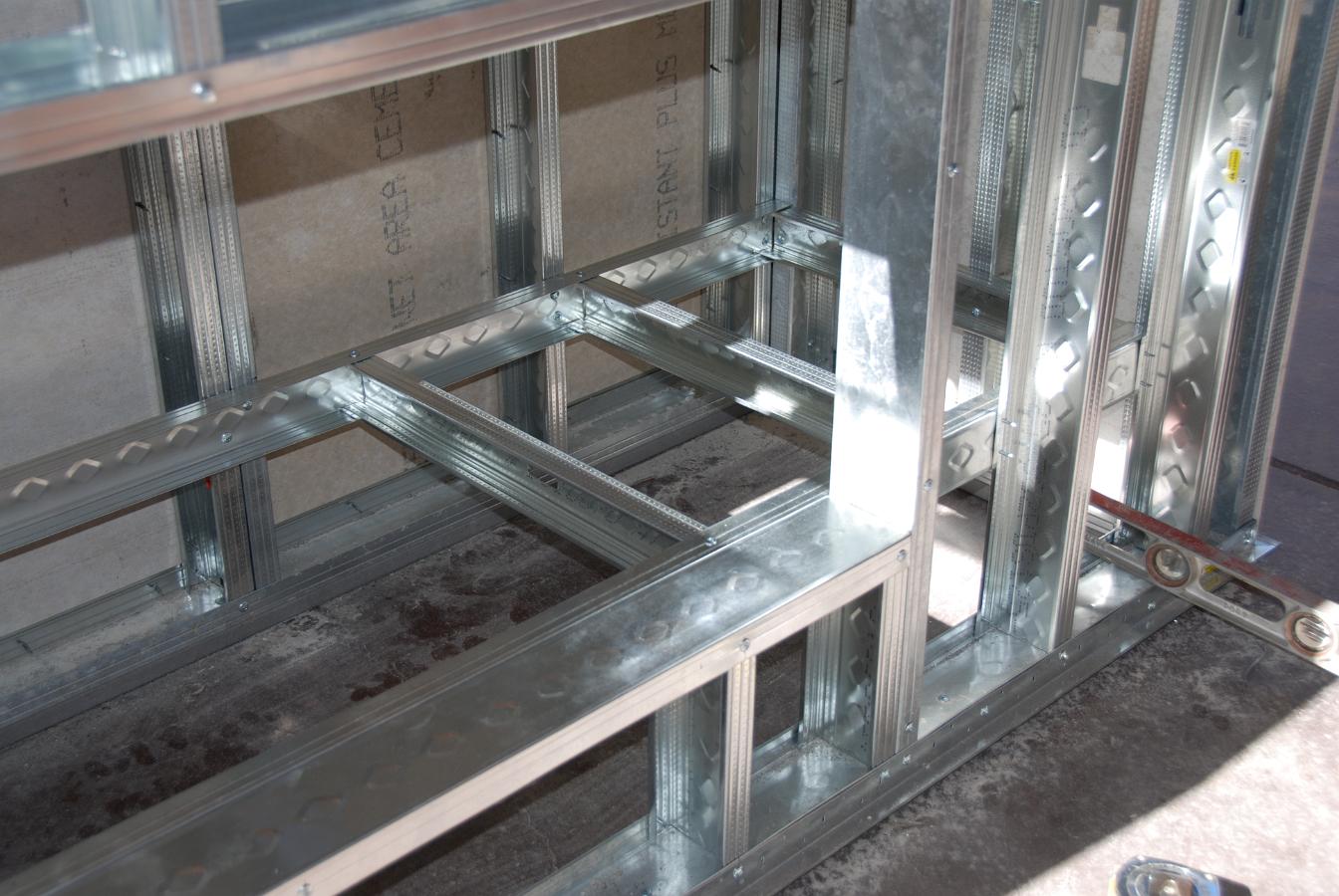 Internal shelf "joists" on 12" centers. Driving in the bottom screws was a pain as my impact driver is too long to fit underneath the framing so I had to use a 90 degree angle drive to drive the self tapping screws.