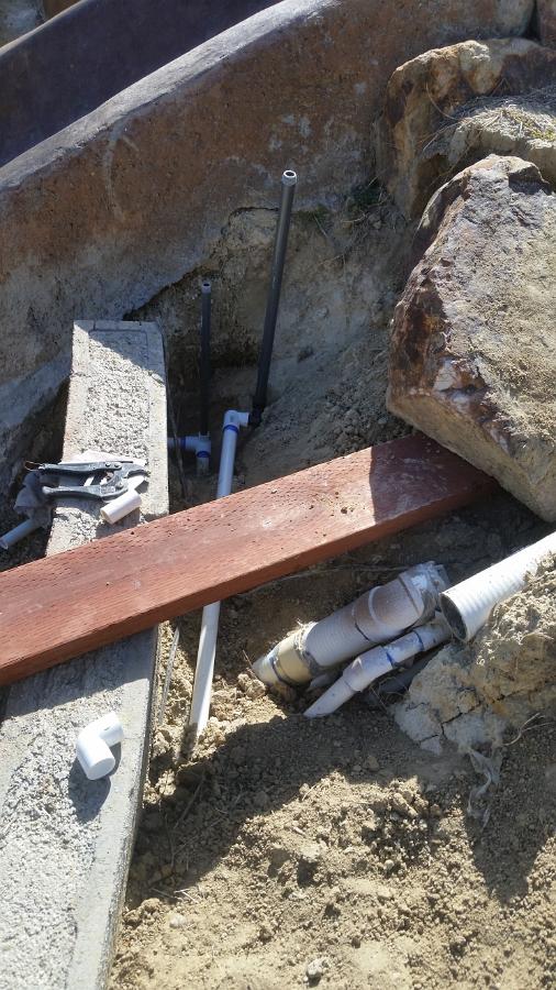 Really tall riser is for the sprinkler shooting up the hill, shorter one on the left is for the air gap for the pool side bed. My drain line got disconnected when I was moving the boulder, so I'll need to button that up before this is all buried.