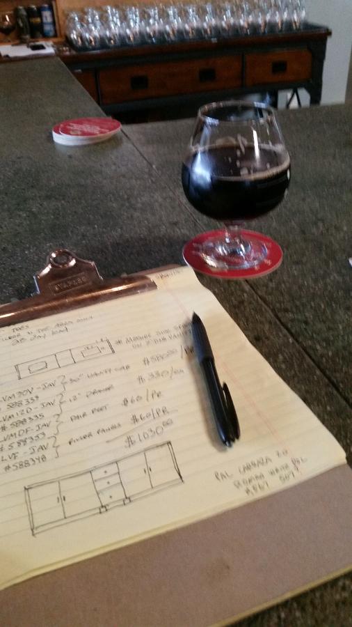 At one of my favorite microbreweries working out the vanity cabinet order. The homeowner initially wanted me to refinish her existing vanity, but after explaining the costs of refinishing versus new, (assuming I could even save her old vanity) she opted for a new unit from Lowes.