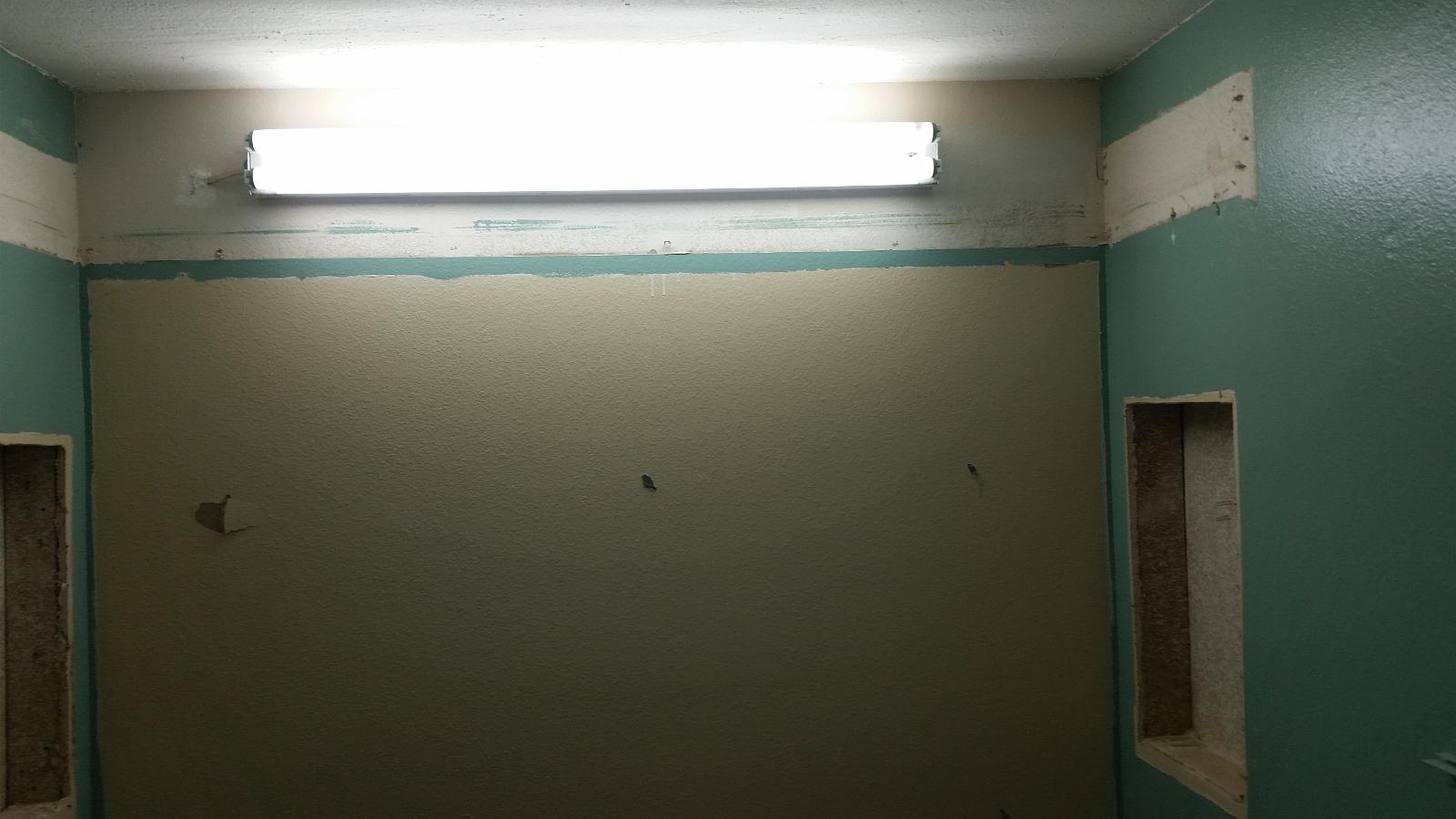 The over-vanity 'fixture' was removed and the light was screwed to the wall as it will be the only source of additional light for the next few weeks.