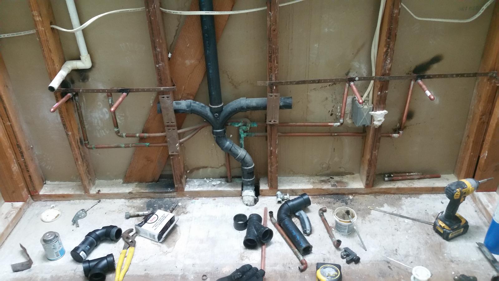 I got the wet wall opened up and got the supplies for the sinks moved. The green blob in the center is concerning, but it's not leaking so I'll try not to mess with it. Just need to relocate the drains.