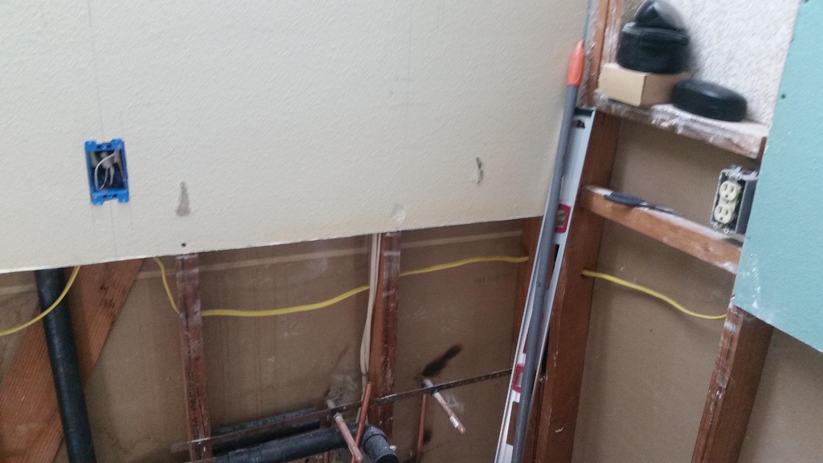 I pulled new feeds to the new outlet at the center of the vanity and to the existing outlet on the right side. The old medicine cabinet locations will be covered up.