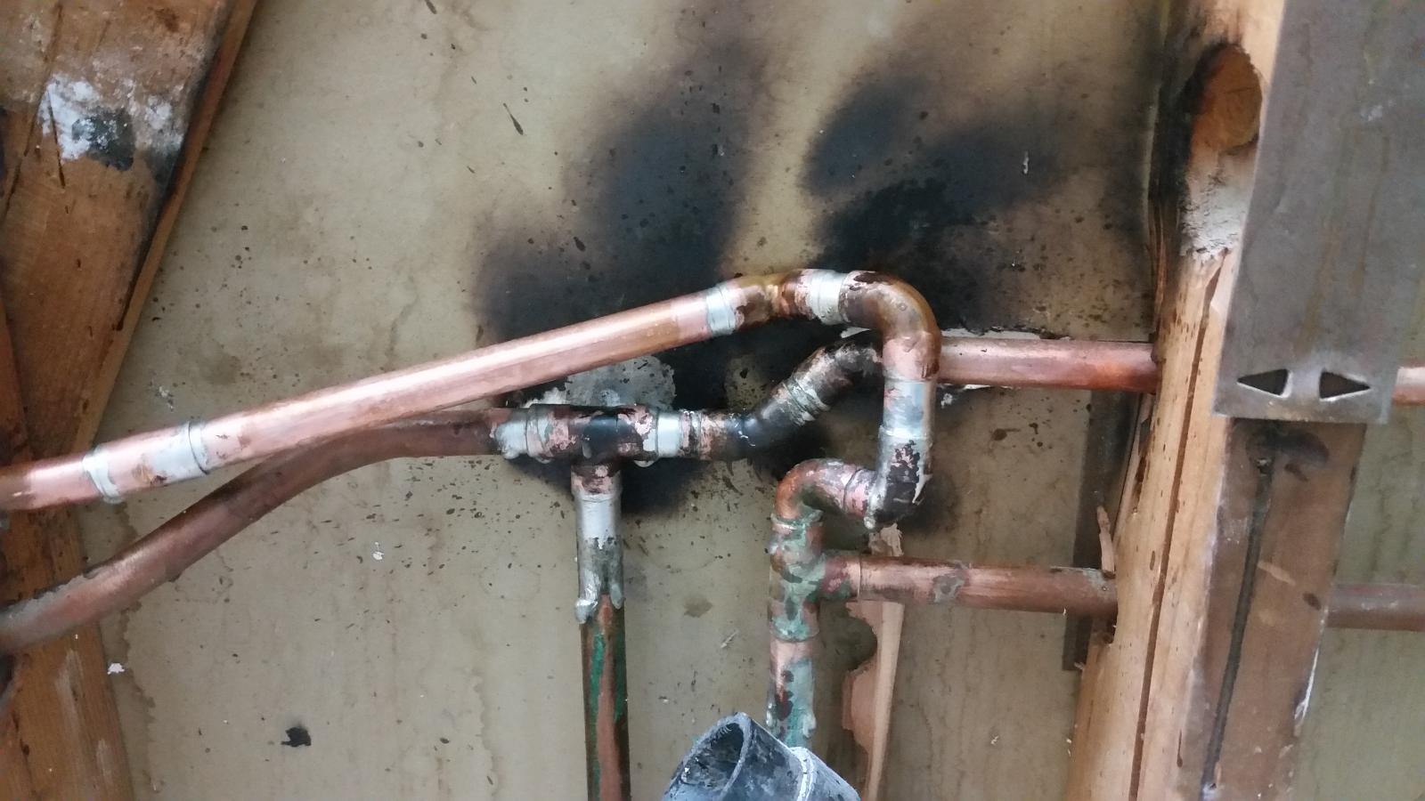 Not my cleanest work, but I had to make do with what I had on-hand. It doesn't leak and nothing is touching any more. Getting solder to stick to really old copper is more than just a little bit of a pain. Now to put the drain back together.