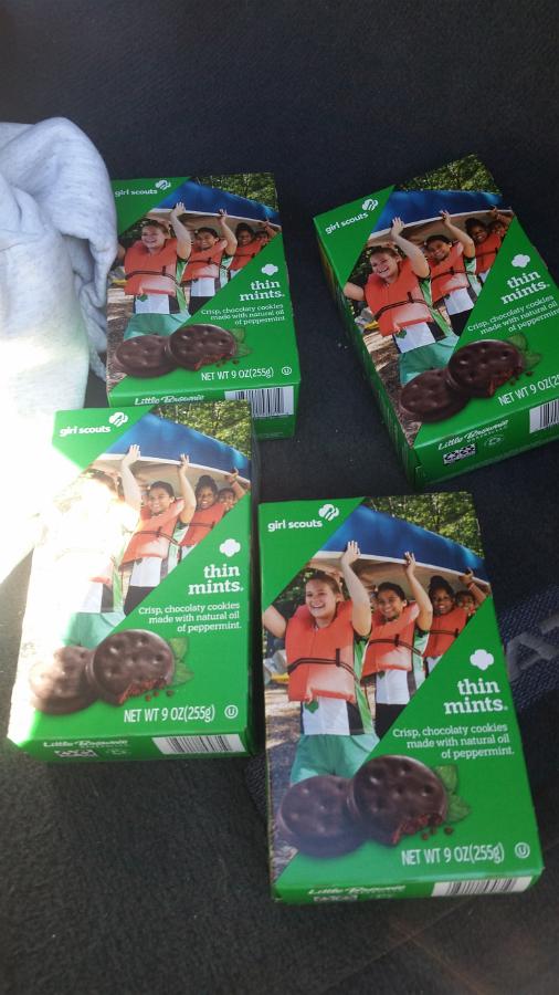 This was kind of funny. I had to run down to my truck to grab something and some Girl Scouts were out front and asked if I wanted to buy some cookies. I didn't have any cash so I told them, "If I had a 20 dollar bill, I'd buy 4 boxes of Thin Mints right now." One of the little capitalists didn't miss a beat and replied, "We take credit cards!". LOL!