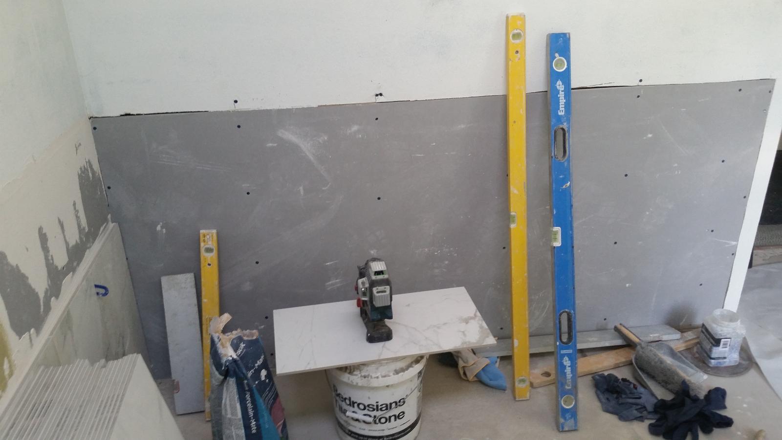 This is the wall directly opposite the shower enclosure. Tile guys have installed their backer and this will get tile about 3 feet up.