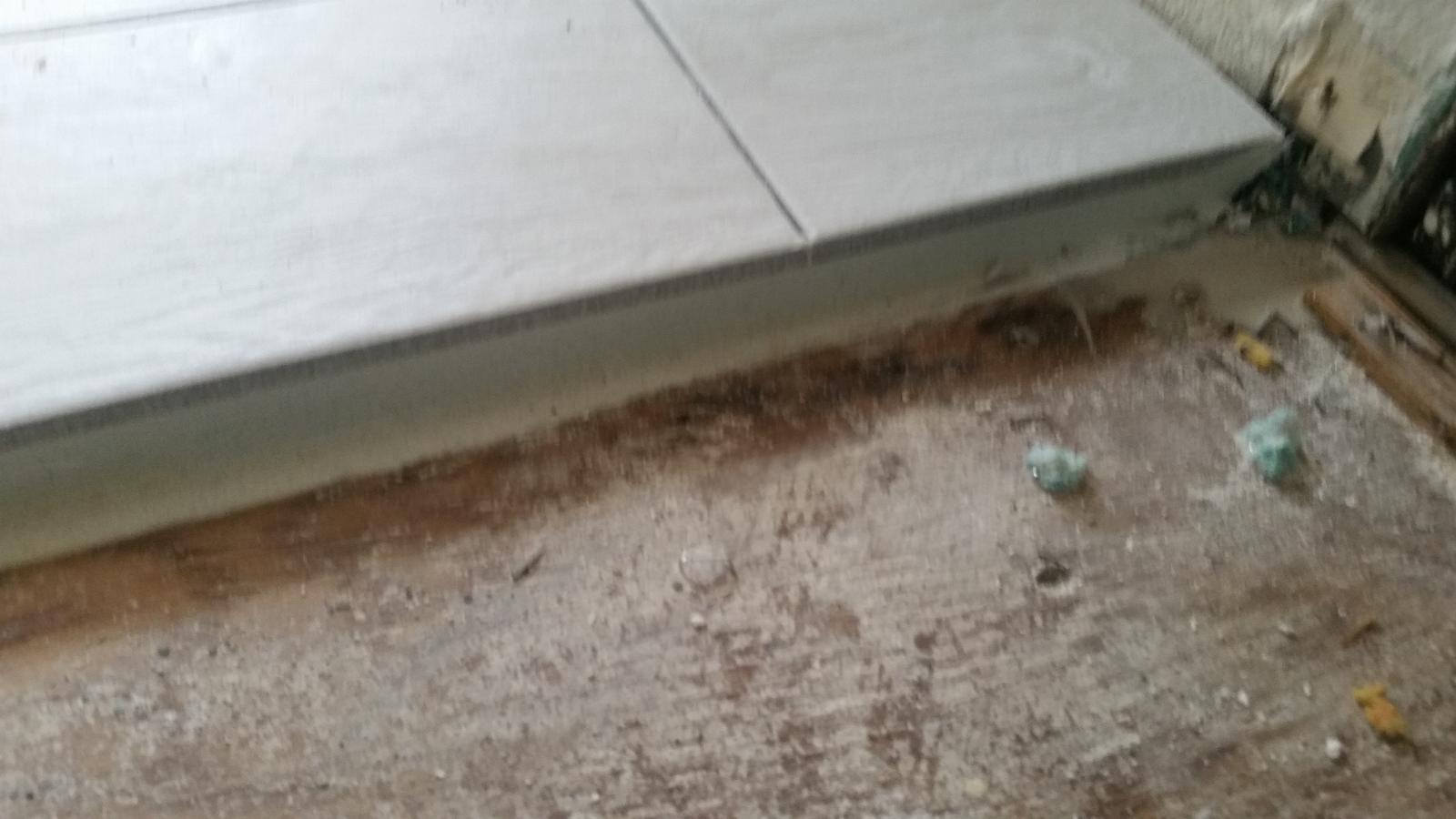The floor tile sits a bit taller than the carpet that will abut this edge, so we'll need to install a wedge under the carpet and stretch the carpet up to the tile.