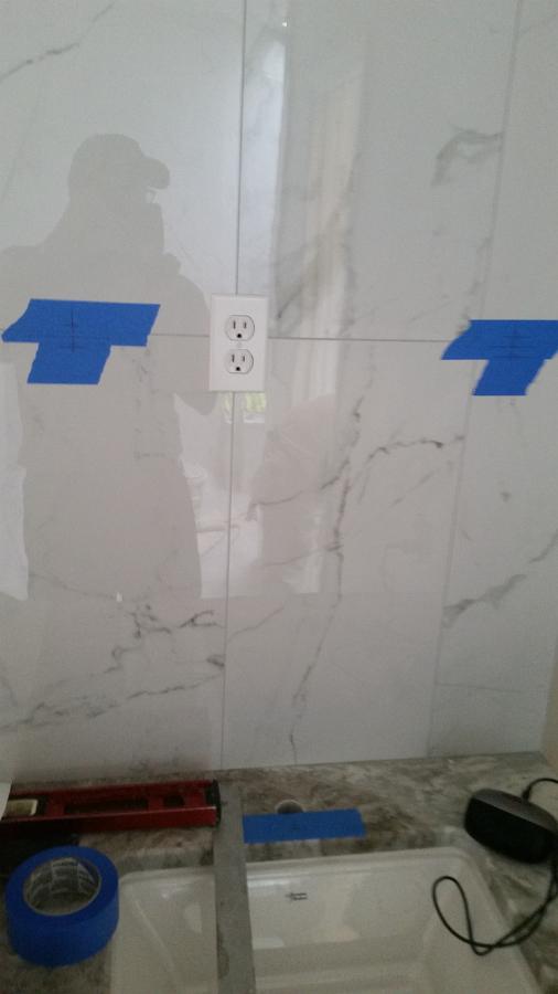 Trimming out the wall behind the vanity. The homeowner decided she wanted tile on this wall too.