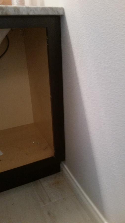 I finally got around to installing the end filler panels on the vanity. I like to do these last so the painter doesn't slop paint all over them doing cut in. If I'm careful, I can get these scribed and installed without even scuffing up the paint on the wall.